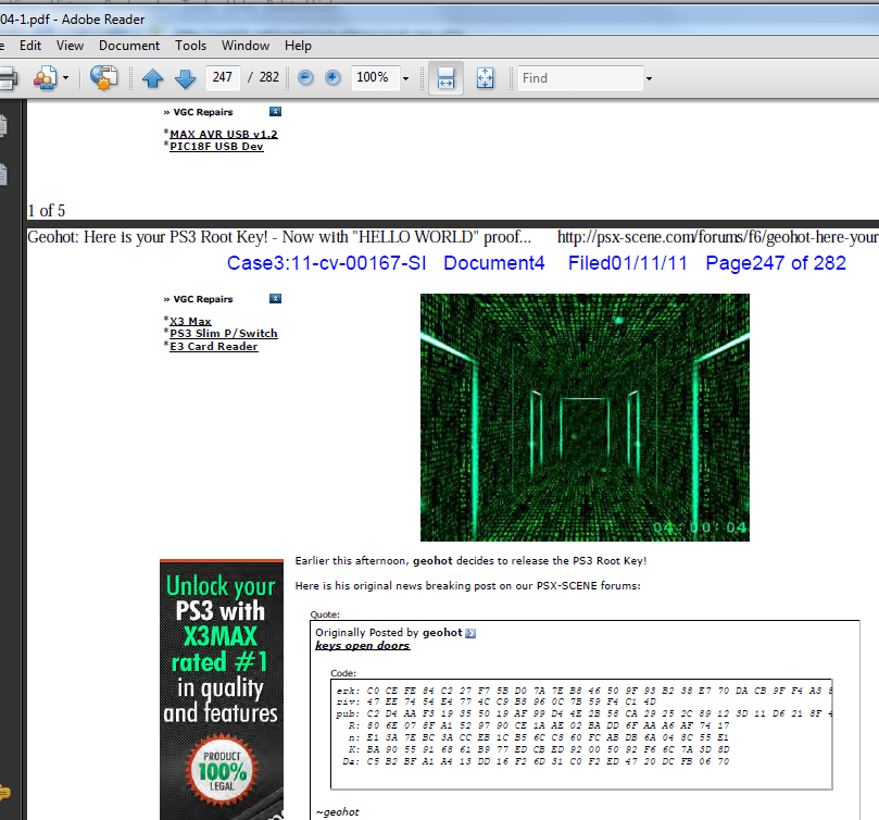 Now, Sony’s legal team included in the court documents a screenshot of a website where GeoHot posted the root keys. These documents are now hosted by several servers including the California court.