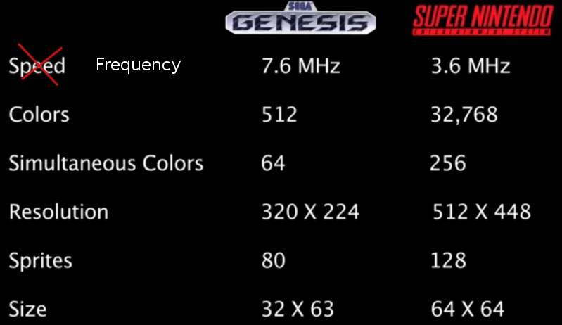 Like I said in part 1, much more important in games are stuff like resolution, colors, sprites and their sizes. And if we look at it, we can see that the SNES whoops the Genesis graphically in every way. It’s also worth noting that while some state that the Genesis processor had more ‘speed’, as it actually only has higher frequency. The SNES processor could output more MIPS (million instructions per second) even at a lower frequency (I will talk more about this ahead in the Frequency Wars). The GPU DMA chipset is where the Genesis was better than the SNES (http://segaretro.org/Blast_Processing). Also, it didn’t help that the SNES also had superior audio capabilities. So much for the Blast Processing fad…