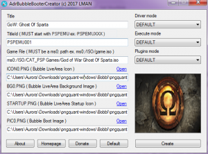 - Fill in the fields in the Adrenaline Bubble Booter Creator application bundled in the RAR file so that you can create and customise your bubble to your liking. You need to put in information such as the game path (from ms0:) and the images you want to use for the LiveArea bubble. You may leave some image fields empty and the default images will be used instead.